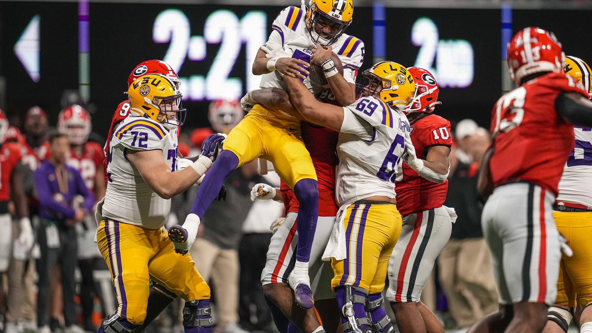 The Tigers early mistakes were too much to overcome and they went into halftime trailing 35-10. A blocked field goal led to Georgia’s first 7 points of the game on a 96-yard return with LSU appearing to be unaware the ball was still live. Another blunder was the Jayden Daniels interception, which somehow bounced off Jack Bech’s helmet and into the hands of Smael Mondon Jr.