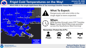 Weather Service: "Frostbite, hypothermia possible" after Arctic blast freezes New Orleans, NorthshoreJanuary 25, 2026 -